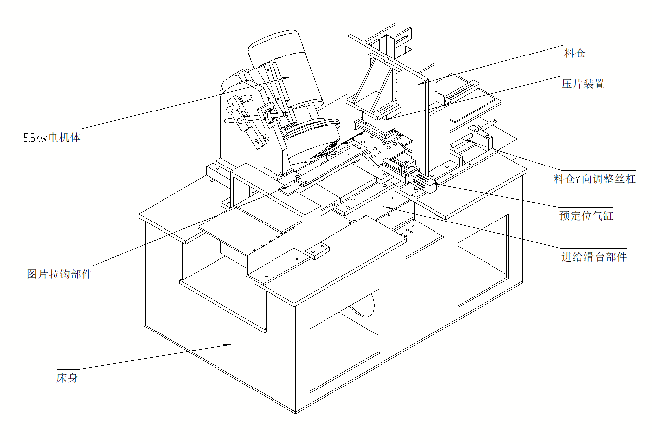 本機主要由機架、模具部件、進給滑臺、砂輪主動力部件、送料料倉、電氣液壓系統、防塵及安全防護裝置等組成。各部件底座由螺栓與床身固定,料倉位于床身右方,砂輪電機部件位于后方,可手動調整電機底座絲杠來控制砂輪磨削角度和深度;產品由伺服電機帶動滑臺動作,使推板推動剎車片滑入模具上,經預定位裝置和壓緊裝置定位壓緊后,通過砂輪進行磨削,然后壓緊裝置松開,滑臺退回帶動剎車片落入接片平臺,磨削完成。